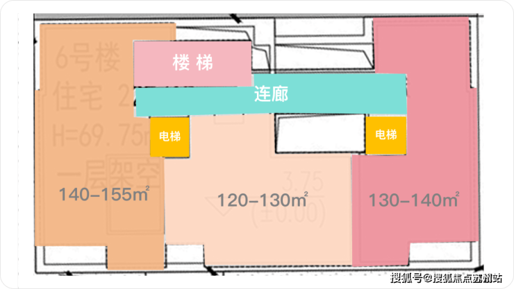 划分为三个单元,都是2梯2户,其中最西单元结构与1号楼相似;中间单元预计为160-180m²3-4房户型,面宽较宽,预计3开间.