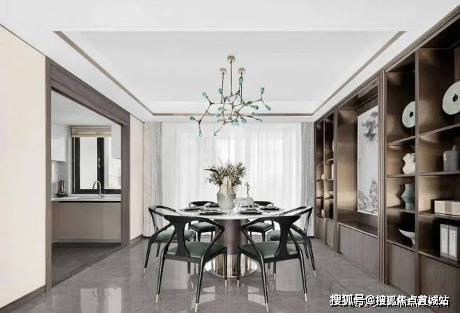 餐厅在整体设计上,沿袭了客厅的配色和风格,简约却又不失格调,尤其是山水墨画元素的融入,让用餐氛围更显温馨感.
