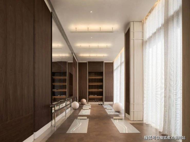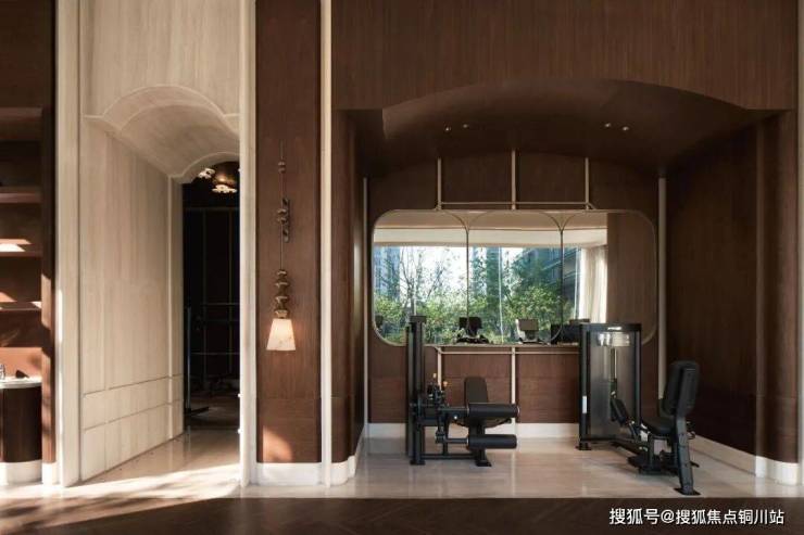 【绿城蕙澜月华官方售楼处咨询热线】400-812-3664(24小时服务,人工客服8:00-22:00) 健身区域实现了动静分区,打造出“引景入眼”的观景运动平台。材料选择上延续木饰面、石材和艺术涂料的搭配,通过石材拼花地面增强空间的精致度。