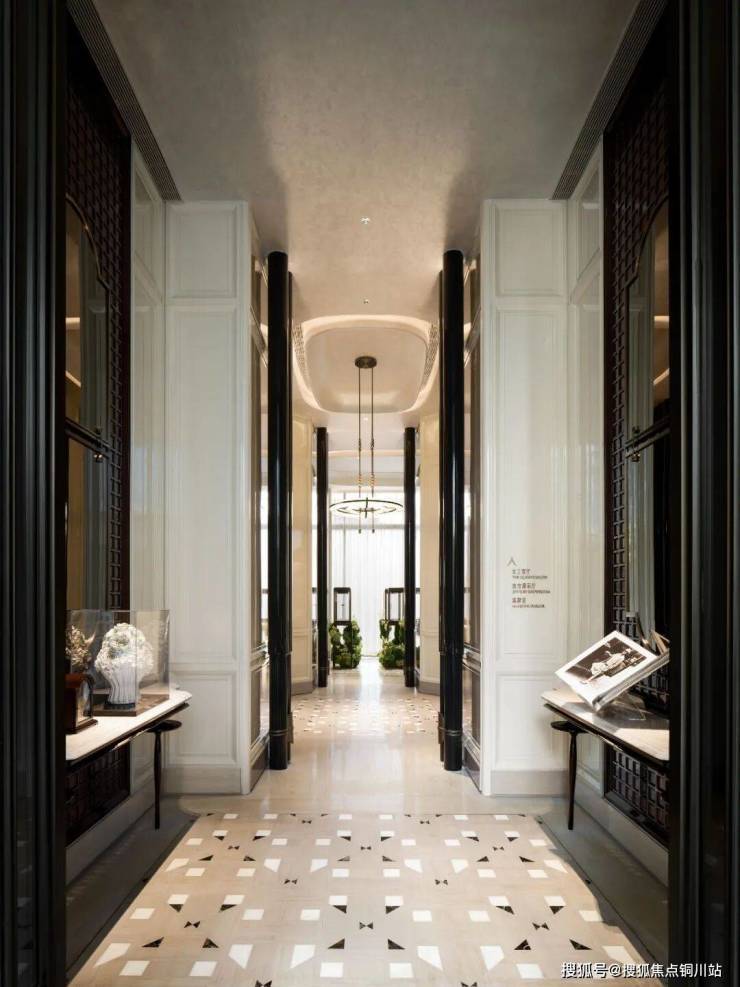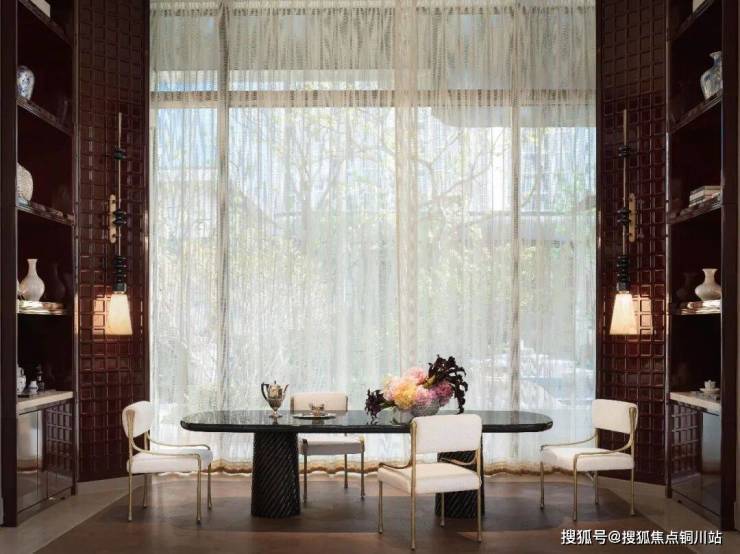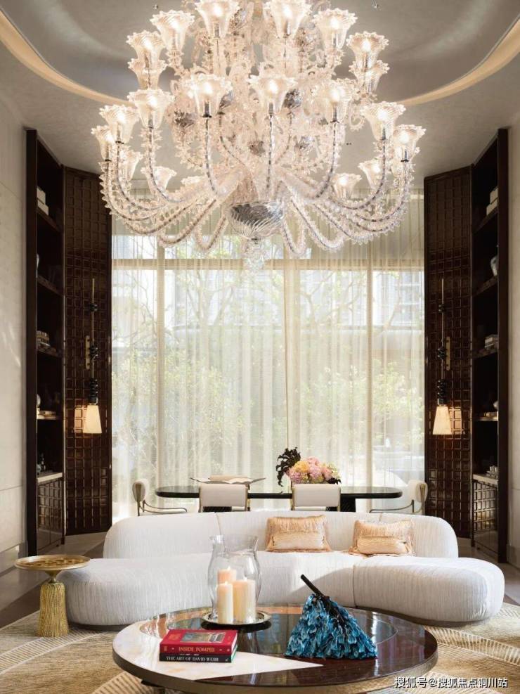 精奢之中,细腻的面料悄然平衡空间的优雅气质:内敛的肌理满足触感的温柔,法国品牌Casamance的刺绣布艺则让细节臻于完美。行走之间,地毯上的丝线随光流转,在不同角度折射出变幻光泽。非物质文化遗产掐丝珐琅工艺,被运用于屏风与边几之上,屏风绘出珍奇画面,边几点缀丝丝妙趣,与空间融为一体。清莹如玉、透亮如水的水晶材料,经精细镂刻,在灯光下演绎光影与空间的浪漫对话。手工敲打的黄铜饰件、木与石的自然拼接,于细微处彰显器物之美与工艺之珍。