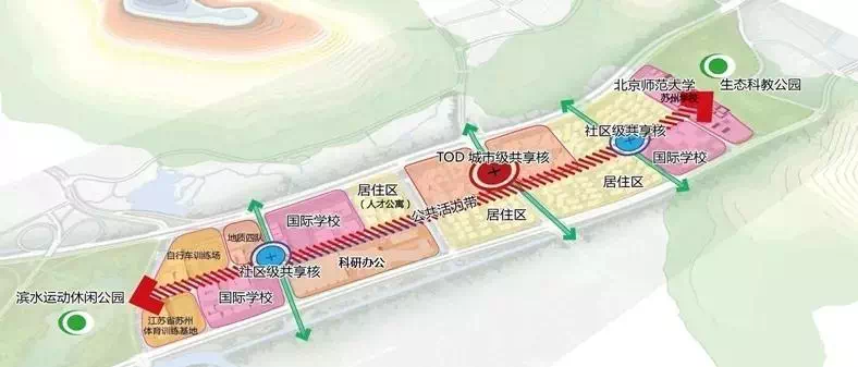 两点:西片区结合康体设施的社区级别共享核,东片区融合教育文体功能的社区级别共享核