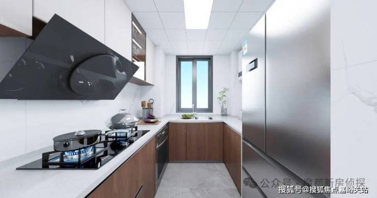 【璟澜湾官方售楼处咨询热线】400-812-3664(24小时服务,人工客服8:00-22:00) 厨房为U型布局,配置定制橱柜、老板烟灶、林内热水器,台面为人造石,水槽为邦克台下盆,细节处体现人性化考量。