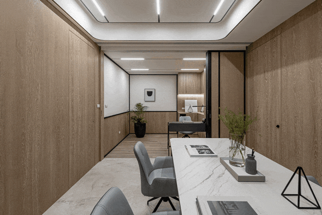 以轻巧隔屏区画出休憩区,温润木皮为主调
