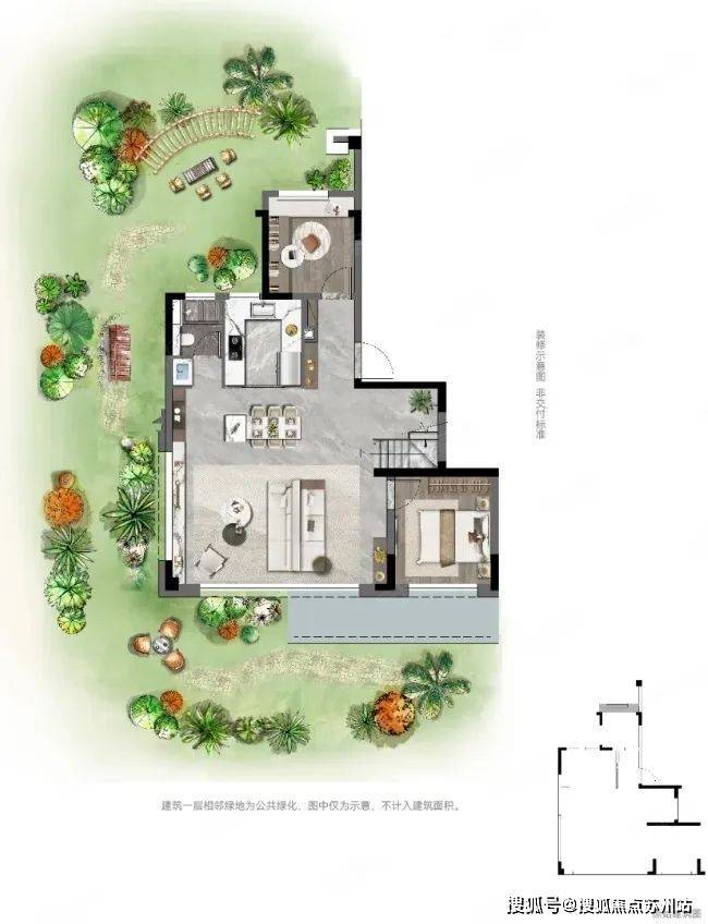 上叠户型,一层LDKB一体化客厅+两个房间,可做老人房或客房。一体化客餐厅直接连通门前绿化,附赠约40-300平庭院。
