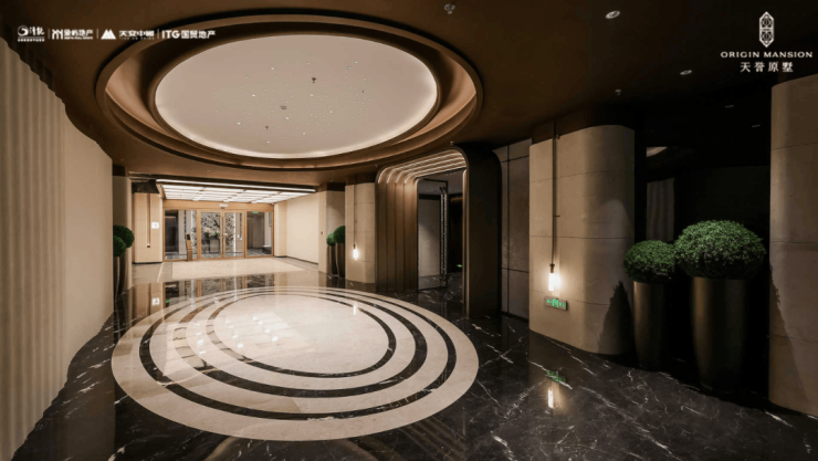 酒店式归家礼序:约54米恢弘门厅,配以约6.5米挑高门廊,两侧臻选金米黄石材与库班绿石材,艺术水景与名贵乔木掩映,归家的仪式感,从第一眼便极致拉升.