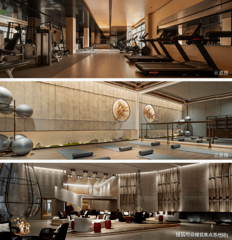 约1400㎡运动会所,设置四季恒温泳池,24小时水循环过滤,颂钵瑜伽空间、高端健身器械等,满足精英阶层对自我管理与生活质感的需求,将生命力体验延伸至各个场景。