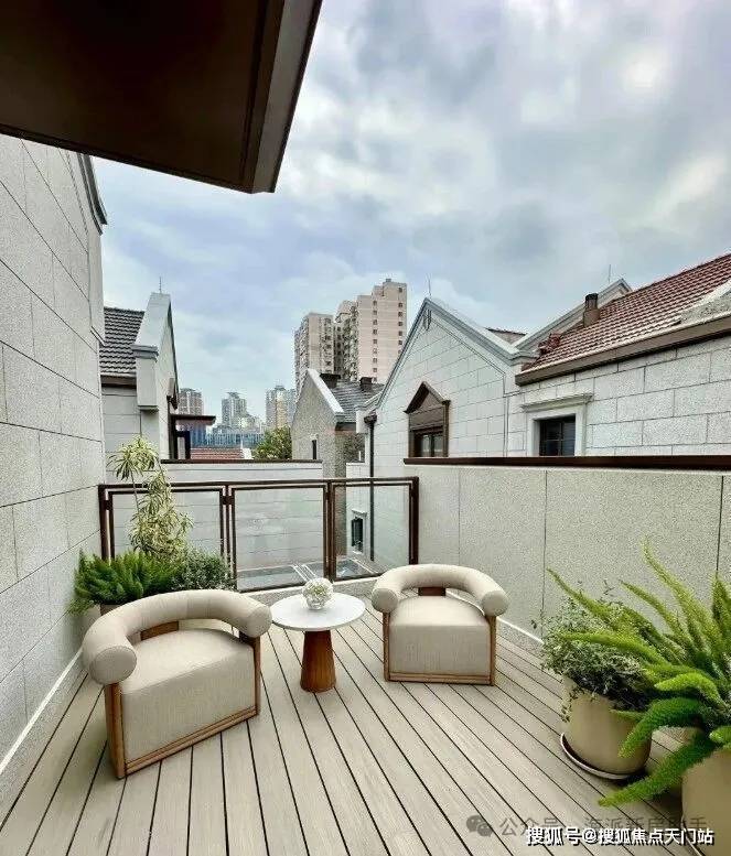从庭园看向别墅,保留的老山墙、砖楣和门头,再加上悬挑阳台和层层露台,这种传统风貌带给人一种重见历史的感慨,又有温馨、宁静的现代舒适感。