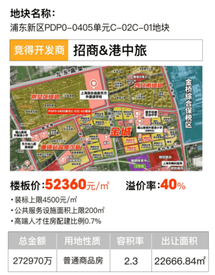 土拍重磅新闻——7月25日上海六批次土拍结束,唐镇地块再次赚足市场眼球!经过62轮鏖战,最终由招商&港中旅以总价27.3亿,楼面价5.24万元/m²夺得!溢价率突破40%!!!未来售价预计将突破9万/m²,已迎来价值爆发窗口期!