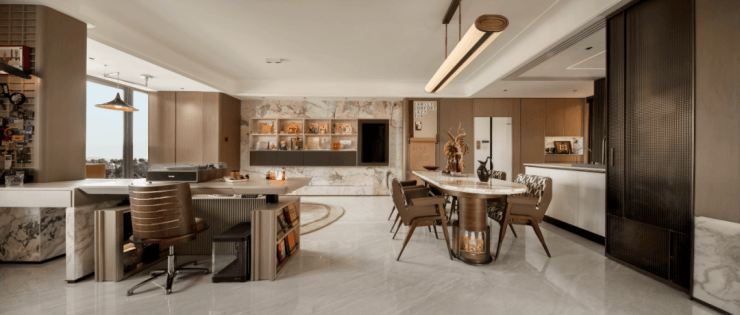 项目归家门庭采用石材,叠加铝板元素,构建出极具质感的空间和松弛氛围,令张江的归家仪式感焕然一新。