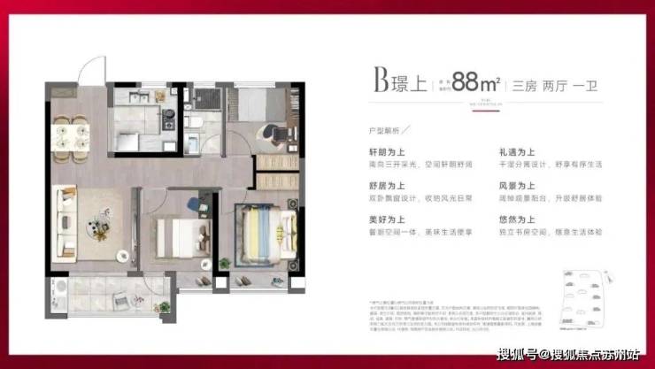 建面约88㎡3房2厅1卫户型,做到了三开间朝南+双朝南卧室带飘窗+动静分离,采光面拉到极致的小3房。这是一个相对主流户型,受众面大,三口、四口之家居住都非常适合,未来流入二手房市场,也能收获更多买家的青睐。