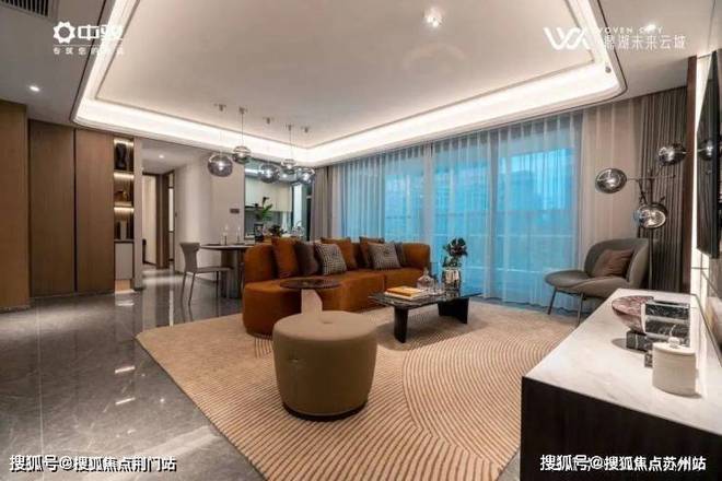 在中骏金辉·未来云城客厅及卧室,梁志天经典造型—三层叠级弧形吊顶装饰天花板,优雅勾勒出高阶生活场域。这项工艺繁复且造价高,耗时为普通吊顶的3倍,常被应用于星级酒店中,足以体现未来云城之用心。