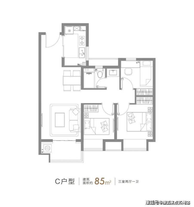 约85㎡的3房2厅1卫,三开间朝南+整体动静分离的设计,都保证了这个户型的居住舒适度。