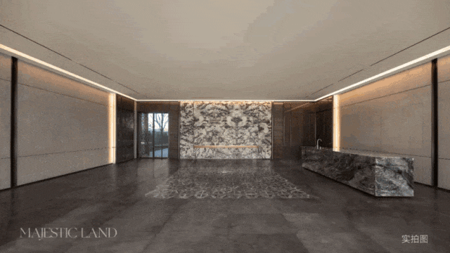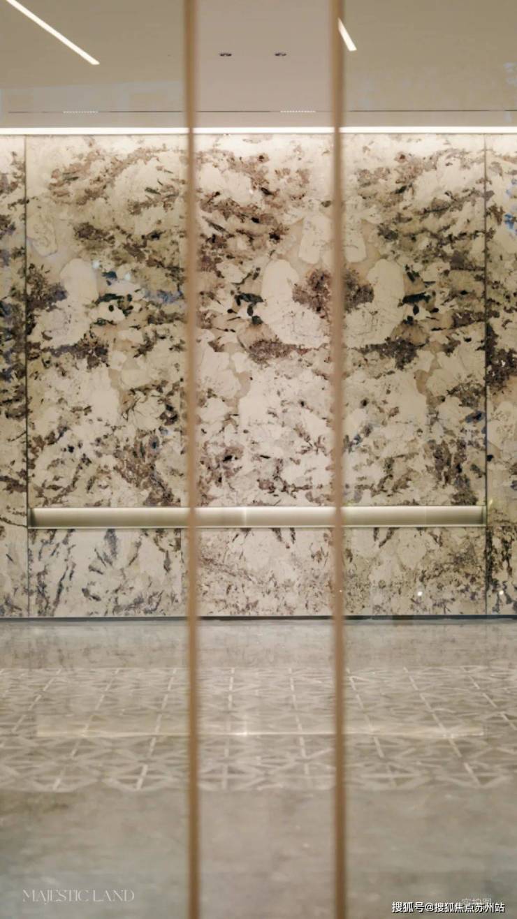 比如,在小区入口,用意大利温德姆灰大理石与云朵拉大理石,再结合金属元素,打造了约44米的酒店式入口。