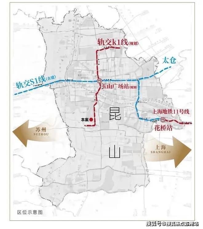 配套设施:【交通】项目距离高铁昆山南站直线距离仅约6公里,规划中的K1线,预计将从项目东侧经过,成为连通南北的轨道交通主干线。K1线未来将在玉山广场站与S1线换乘(规划),可抵达苏州、上海等地,真正实现“三地同城化”。