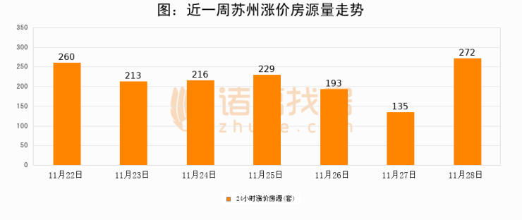 根据诸葛找房数据显示,苏州24小时涨价房源量为272套,较11月27日增加137套,环比上涨101.5%。与此同时,涨价房源占比小幅扩大,业主信心有所提升。