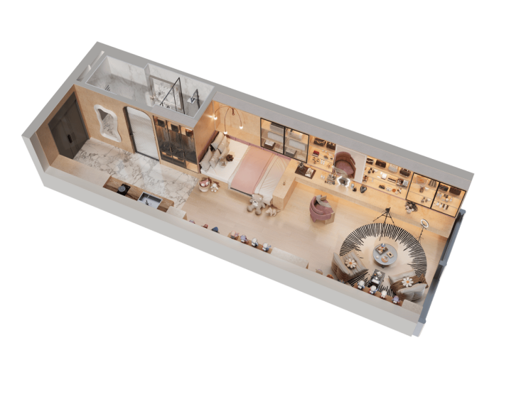 约3.9米的开阔层高,更是打破了传统小户型的压抑感,让空间显得更加敞亮与通透。