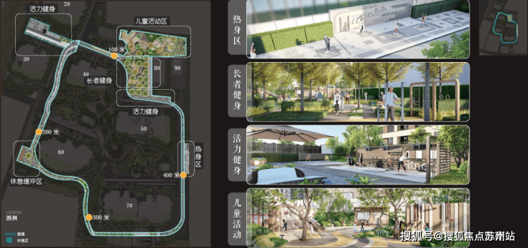 五大运动活力系统:热身区、定制主题儿童活动区、老年健身区、活力健身区和休憩缓冲区,并由约400M跑道串联;