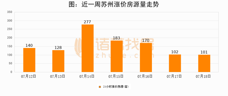 根据诸葛找房数据显示,苏州24小时涨价房源量为101套,较07月17日减少1套,环比下降1%。与此同时,涨价房源占比小幅回落,对于购房者来说是一个入市窗口期,购房者可抓住时机入市。