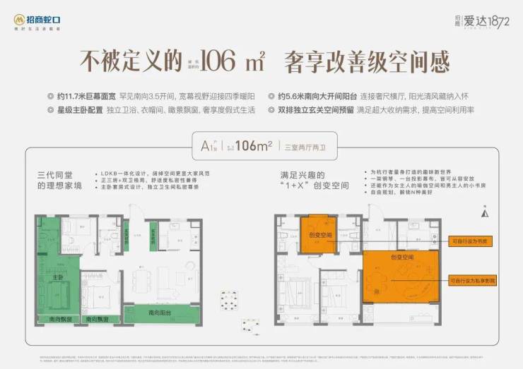 与常见的中间套户型不同,招商爱达1872的约106㎡,南向有3.5开间,面宽约有11.7米.如此一来,可以将更多南向开间面,留给餐客厅,同时外接约5.6米长的南阳台,让公区显得更为阔绰.