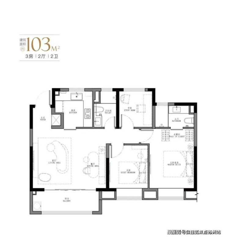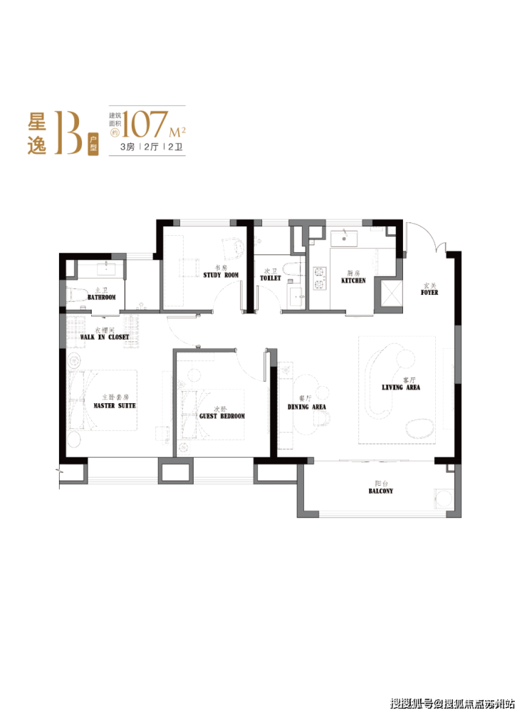 项目约103-107㎡3房2卫设计,有着 宽绰的大横厅设计,并且3.5开间朝南。