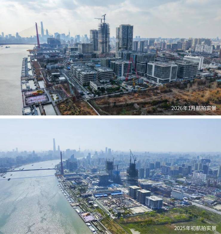 年前小胖君又去航拍了一趟杨浦滨江,恢弘钜制已然实景呈现:(上图是2026年1月的航拍实景,下图是2025年初的航拍实景,直观去对比,建设速度确实快,变化很大)