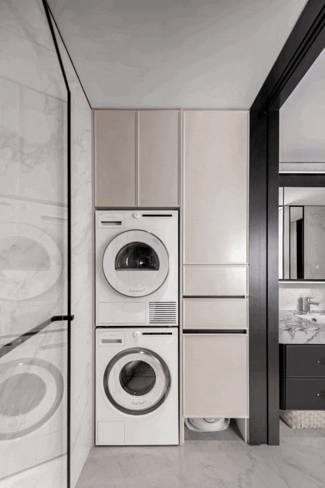 公卫还有全尺寸衣帽收纳空间以及配备洗烘套装的家政间,共同构成了一个高效、便捷的收纳体系。