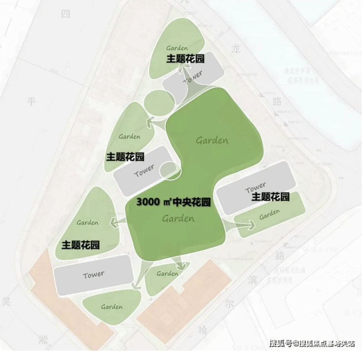 社区景观上,突破市区项目常见的「兵列树阵式」布局,通过建筑楼体的精密偏转,形成罕见的围合式社区形态。