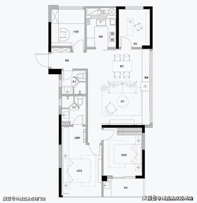 (建面约) 111㎡边套做了四房,面宽约6.1米的一体化餐客厅,面积近30㎡!南向双卧,同样有着面宽约6.4米的南向双联阳台。
