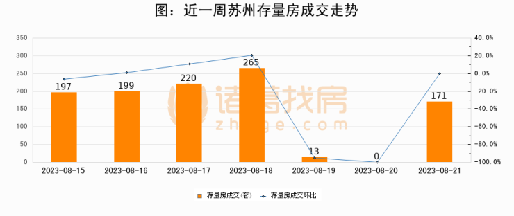 从存量房来看,2023年08月21日苏州存量房单日成交171套,比昨日增加171套,环比上涨0%。从近一周存量房成交来看,苏州存量房日均成交套数为152套,08月21日单日成交171套,高于近一周平均水平12.5%。