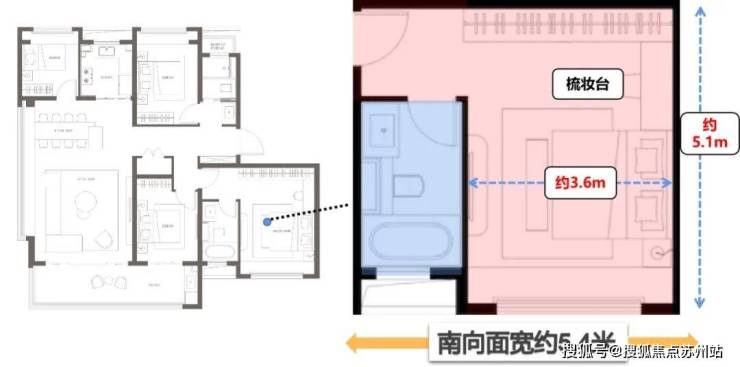 值得重点关注的主卧套房惊艳设计,面积达到近28㎡,不仅有超3.6米的阔绰空间,步入式的衣帽间+梳妆台,而且居然拥有一个朝南开间近1.8m的卫生间,大胆又奢侈。