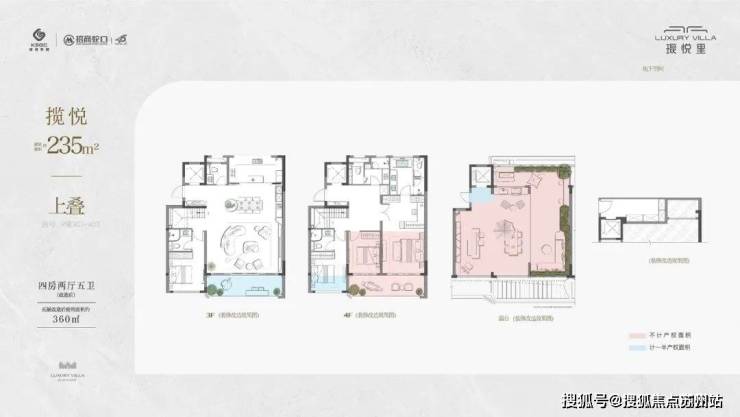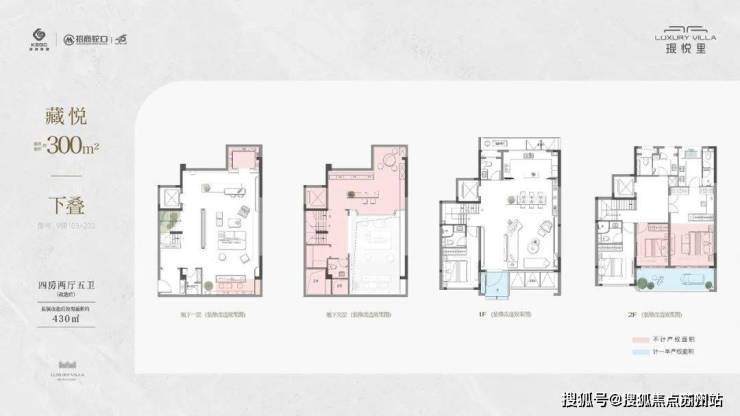 •建筑面积约300㎡下叠,实得面积约430㎡,四房两厅五卫