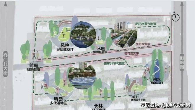 南北区:共计约1500M,与儿童活动、老年乐园、中青年健身平台、阳光草坪、休闲交流等贯穿,加之24节气,形成不同的功能体验。