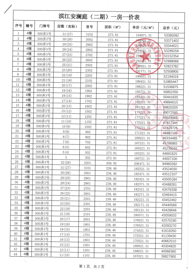 一房一价表: