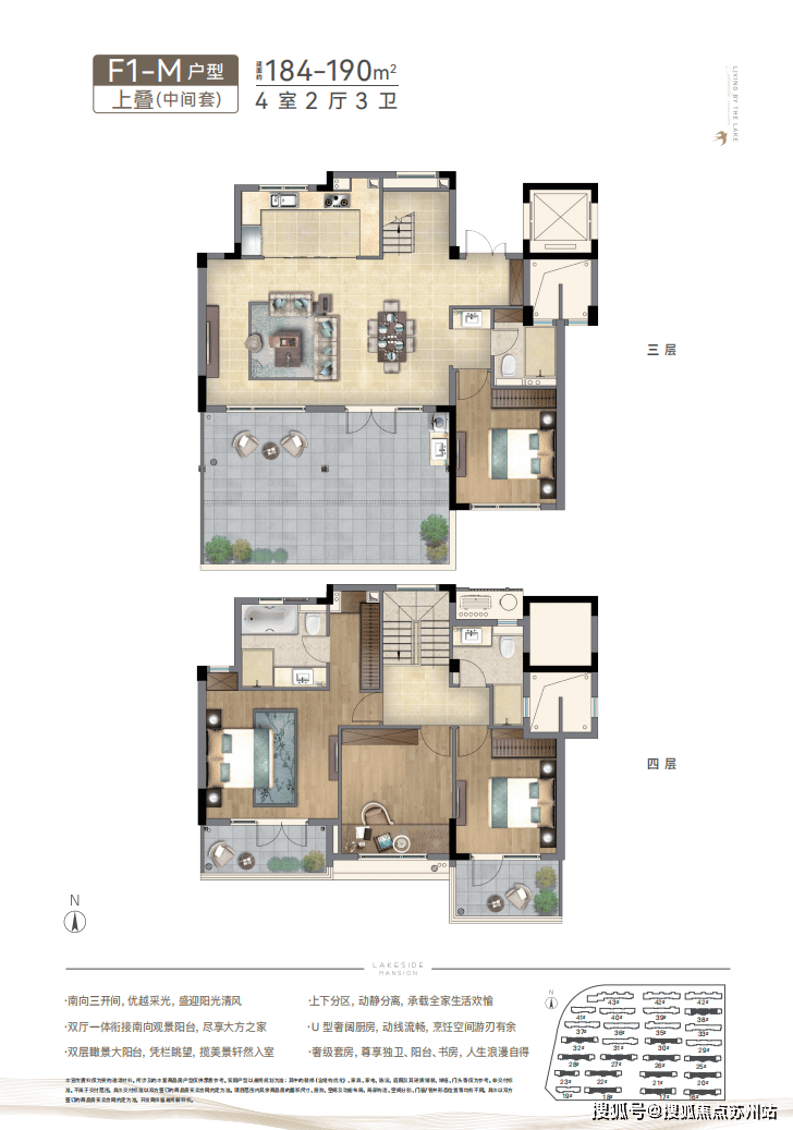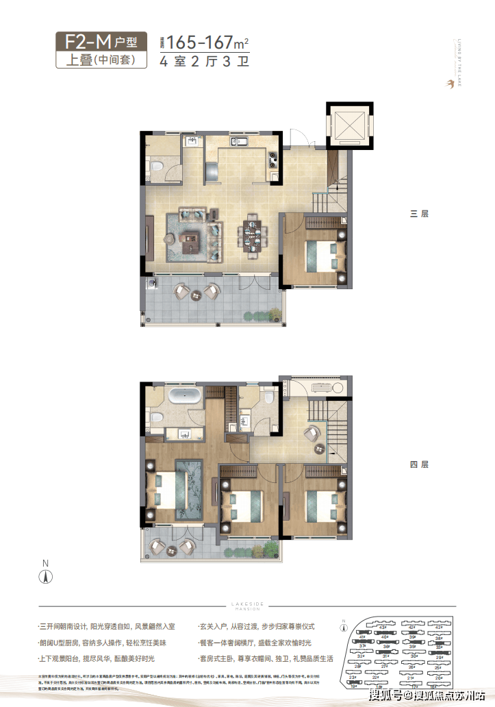 新亚洲洋房则展现通透型格,宁静淡雅,采用坡屋顶、深挑檐,描摹中式建筑神韵;大面落地窗,蓝灰色LOW-E玻璃,让阳光照进每一寸空间;内敛的建筑气质、沉稳的质感、舒适至上的空间,营造融于湖光天地的美好温度。