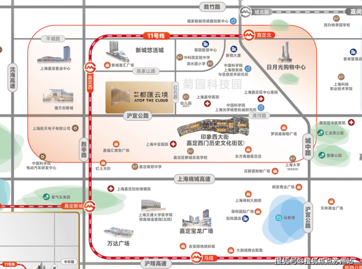 交通方面:项目距离轨道交通11号线嘉定西站直线400米左右,附近还有嘉定客运中心,交通便捷。另外,项目临近沪宜公路、距离沈海高速约1.5公里,上海绕城高速约3.5公里,自驾出行也十分便捷。