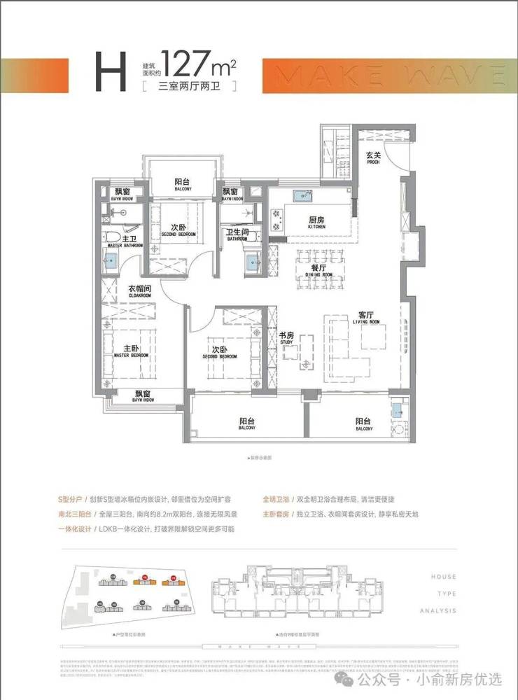除了标准的三开间朝南之外,项目还采用了S墙设计,释放了厨房空间,让小户型也能放下门冰箱。