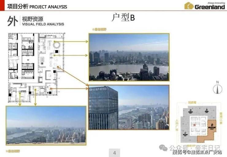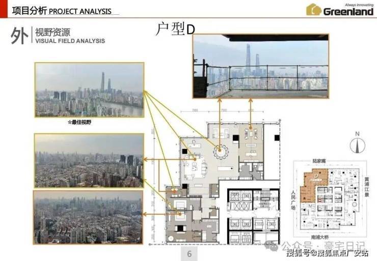 本案北视角:陆家嘴、北外滩;西视角:人民广场、新天地;东视角:浦东、黄浦江;南视角:南浦大桥、世博园.