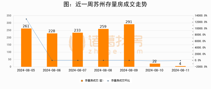 从存量房来看,2024年08月11日苏州存量房单日成交4套,比昨日减少18套,环比下降81.8%。从近一周存量房成交来看,苏州存量房日均成交套数为185套,08月11日单日成交4套,低于近一周平均水平97.8%。