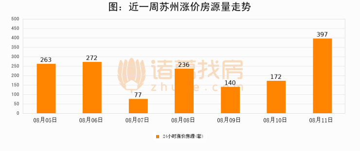 根据诸葛找房数据显示,苏州24小时涨价房源量为397套,较08月10日增加225套,环比上涨130.8%。与此同时,涨价房源占比小幅扩大,业主信心有所提升。