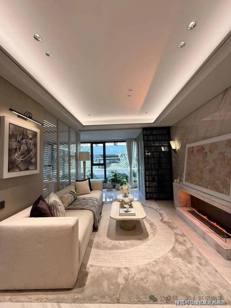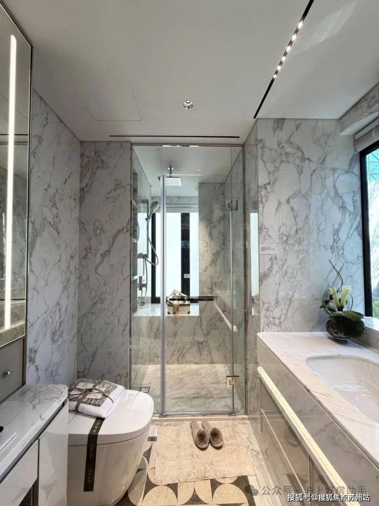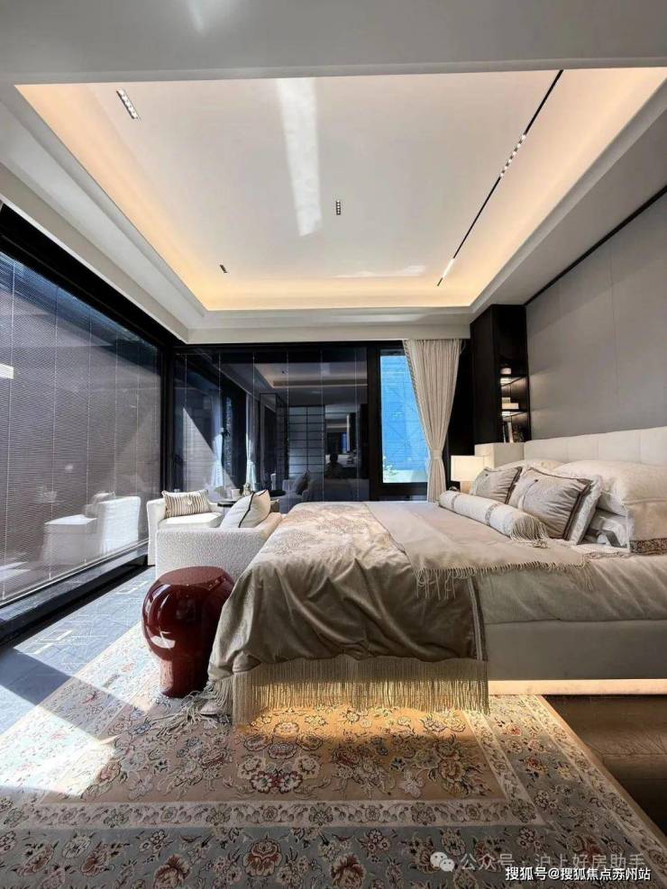 以整块奢岩破题,以皮革融入,白金沙岩板、140户型采用罗马白洞石岩板,主卧背景采用了车线工艺硬包,将豪宅标配升华为材质的史诗。