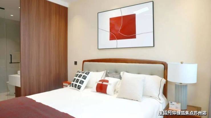 主卧整体空间布局规整、通透,无过多堆砌。以米黄墙面为基底,柔和、温暖,酒红色床尾巾与床头挂画的红色元素相呼应,在淡雅中添一抹亮色,如同宋画中巧妙点缀的色彩,不张扬却点睛。