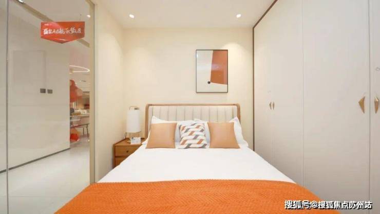 次卧空间简洁大方,注重留白,静谧、清幽。浅米色墙面搭配白色衣柜,色调素雅、纯净。橙色床尾巾与抱枕为空间注入活力,似宋瓷上的窑变色彩,自然而美妙。
