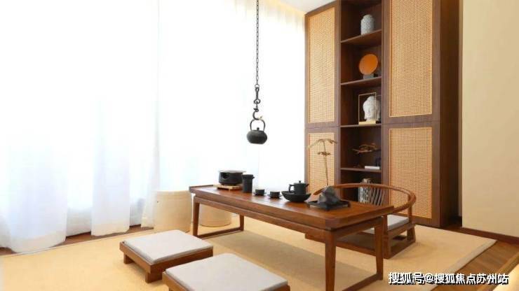 茶室是这个样板间的一大亮点,也是宋氏美学风格的集中体现。木质的地板让整体感受温润舒适,墙面局部挂着书法作品,为茶室增添了浓厚的文化氛围。