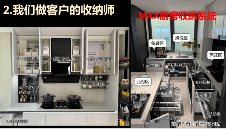 1.厨房收纳系统:包括MAX厨房收纳系统、岛台骑马抽、暖碟抽、岛台薄柜等,提供了充足的厨房收纳空间。