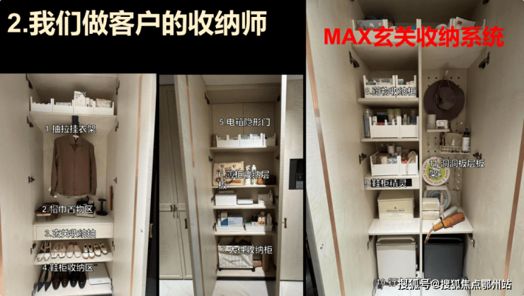 2.玄关收纳系统:抽拉挂衣架、帽巾置物区、玄关收纳抽、鞋柜收纳区等,方便日常物品的存放。