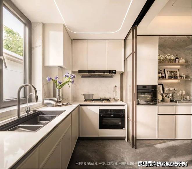 厨电配置了意大利进口品牌SMEG的灶台油烟机、博世太空舱五合一(蒸烤炸炖煮)蒸烤一体机与博世15套嵌入式洗碗机,霍尼韦尔前端净水器与末端净水器(或同等品牌,以实际交付为准)。水槽采用魔力多功能水槽龙头以及枪灰色不锈钢表面大单槽。
