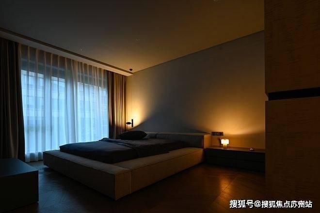 从客厅行至卧室,光线也由明转暗,携手人们渐入佳境。温暖柔和的光线呈点状晕散,柔顺迂回的线条在暗影中浮现,朦胧暧昧的氛围大面积散开,为夜色中的好时光作陪衬。