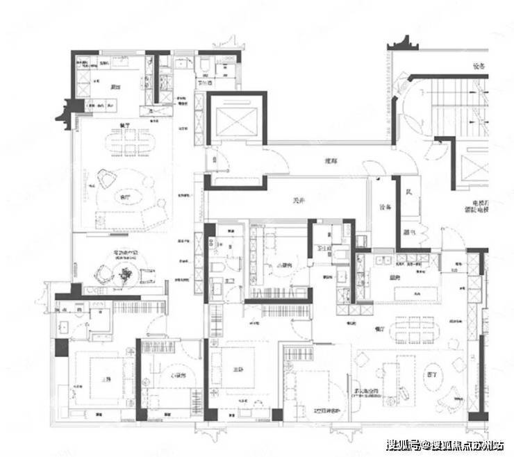 大户型2梯2户,小户型3梯4户设计,其中值得注意的是123㎡小户型在此玩了一个高明的“空间魔法”:用3梯4户的配置,给123㎡的边套也变出了“一梯一户”的尊贵感。这让南向两面宽的短板,瞬间被极强的入户私密性和仪式感所弥补。3.社区全架空层设计