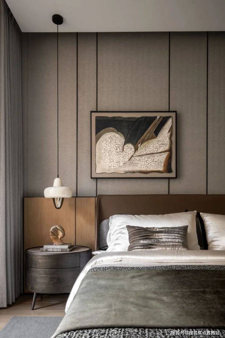 次卧的色调相对更为深邃,设计师通过不同的色彩选择,为静谧的氛围赋予了别样的诠释.有的空间明亮温暖,有的则内敛深沉,各种高品质材料相互搭配,编织出柔软而舒适的触感,再辅以恰到好处的艺术装饰,将空间的高级感提升到新的高度.
