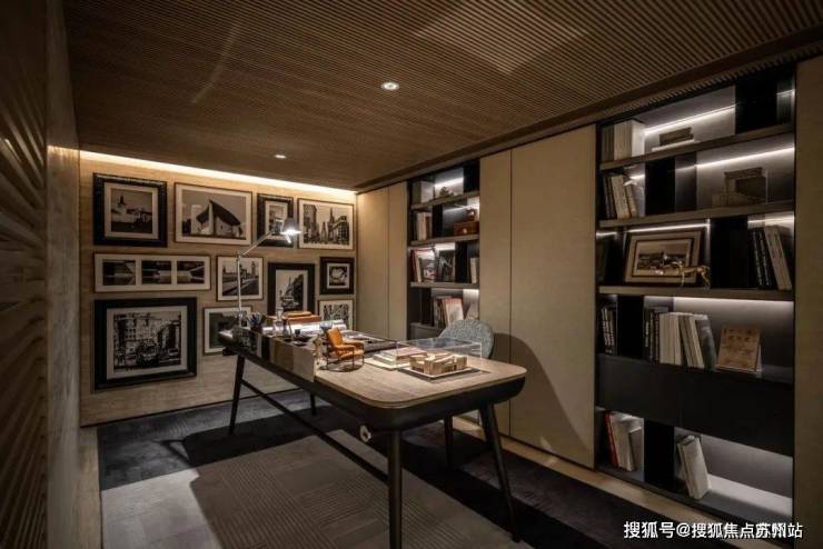 书架以及空间中预先设定的轮廓线条,精准地勾勒出隔而不断的空间形态.书架仿佛具有神奇的魔力,打破了空间的界限,将会客区、餐厅、书房与文化韵味巧妙融合,每个区域既相互关联,又有着各自独特的层次,形成了一种和谐而又富有变化的空间秩序.